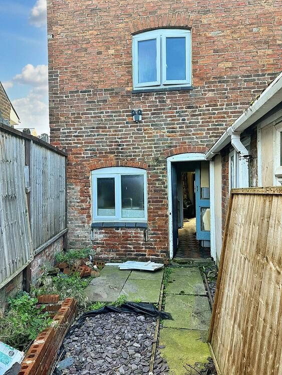 There is a small walled-in front garden and small enclosed rear yard with outbuilding.