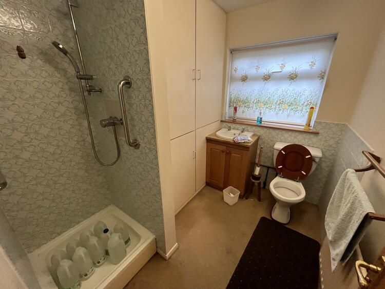 Comprising low flush w.c. wash hand basin and shower cubicle. Linen cupboard, radiator and window to rear.