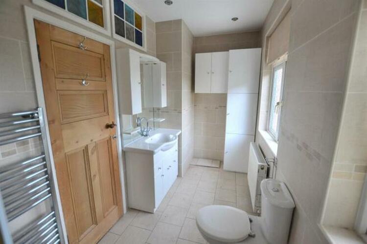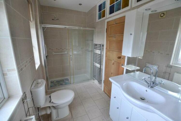 Double shower cubicle, low flush w.c. wash hand basin with cupboards under. Heated towel rail. Built in storage cupboard, radiator, uPVC double glazed window.