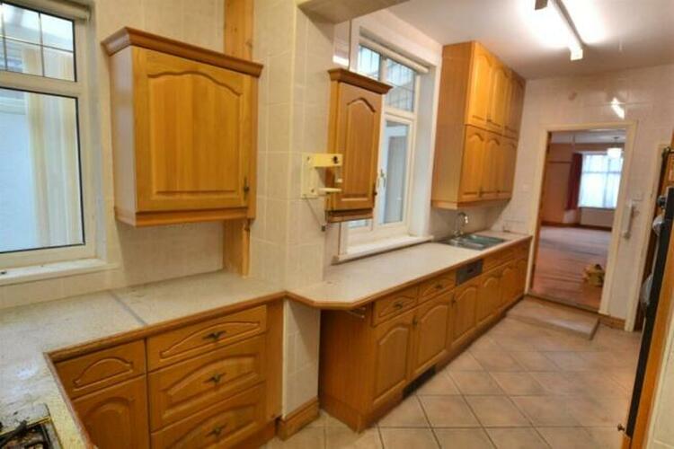 With wall and base units, work surface, hob with extractor fan over, radiator, uPVC double glazed windows to the side elevation with wood stripped doors accessing understairs pantry.