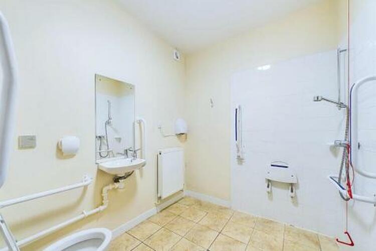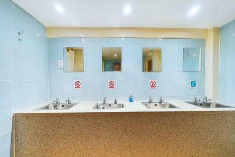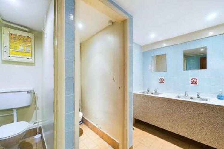 Fully tiled and fitted with two shower cubicles with mains showers over, three inset stainless steel sinks and two low level flush WCs.