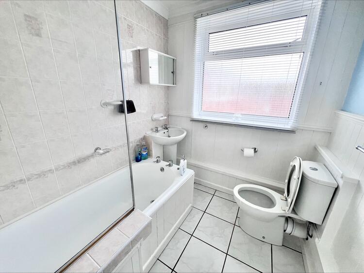 Tiled flooring, white fronted wall and base units, wooden work surface, electric cooker, stainless steel sink with mixer tap, tiled walls, ceiling light point, UPVC double glazed window to the rear, UPVC single glazed sliding window and ceiling light point.