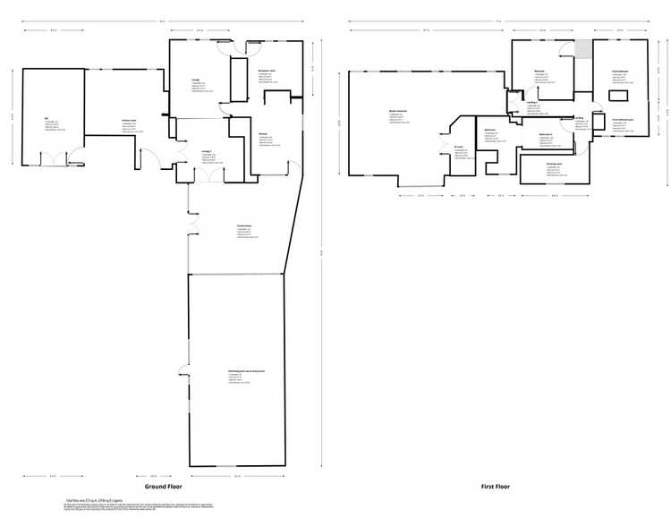 In summary, the layout includes an entrance hallway, a large lounge, an open-plan dining area leading to the kitchen, a cinema room, a bar room, a conservatory, an indoor pool, and a sauna. On the first floor, you will find a master bedroom with an ensuite, two additional double bedrooms, one with a dressing room, a family bathroom, and a single bedroom.