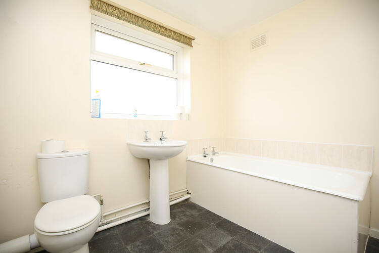 Opaque double glazed window to front aspect, chrome towel radiator, low level WC, pedestal wash hand basin with a panelled bath.
