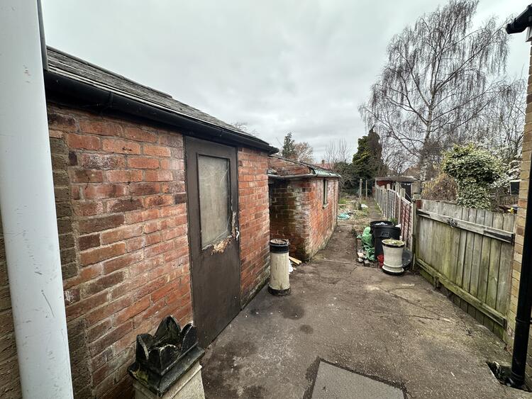 Rear yard area leading onto a lawned garden and having brick outbuilding.