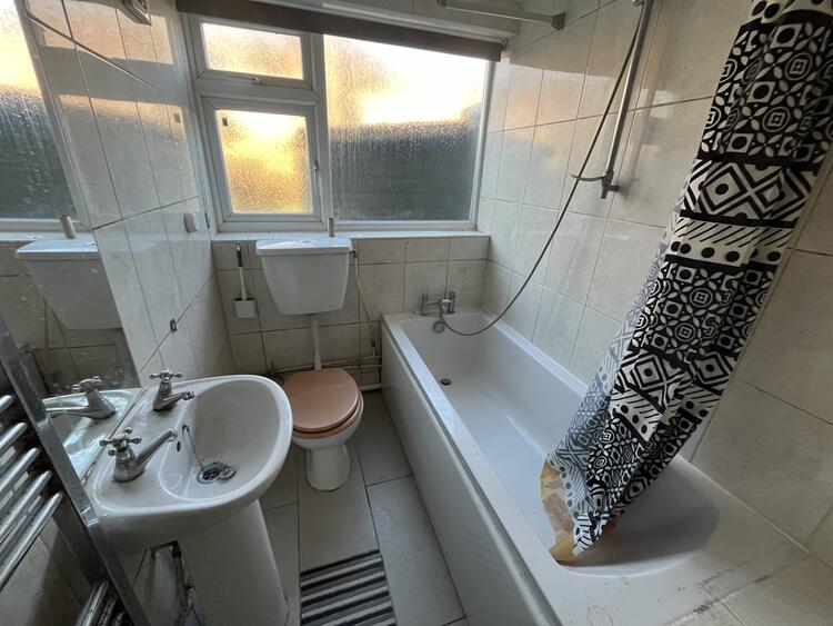 Comprising low flush w.c. wash hand basin and panel bath with shower over. Tiled walls and floors, heated towel rail and window to rear.