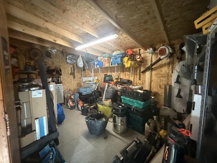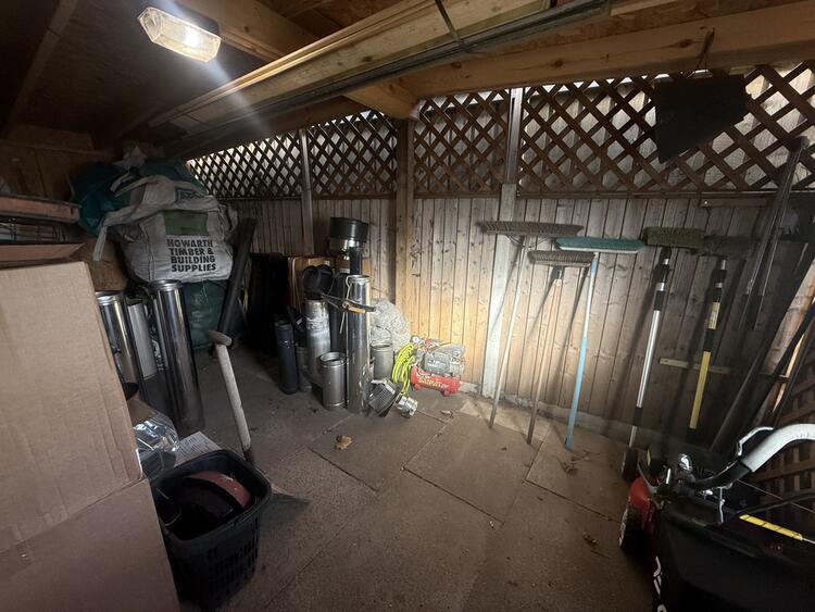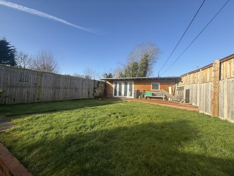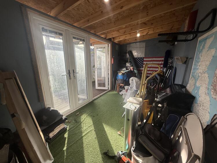The front of the property offers a driveway with ample parking, side access to the rear garden, and a private enclosed rear garden that includes a large patio and lawn area. At the back of the garden, there is a substantial outbuilding with three storage rooms and a decking area.