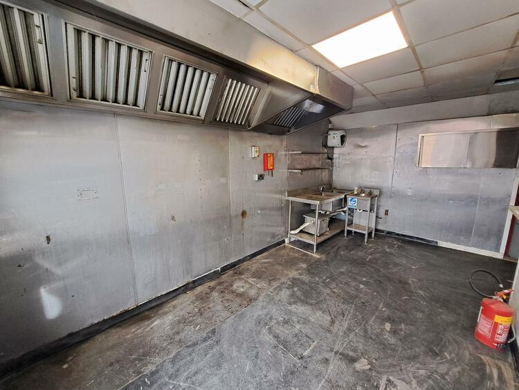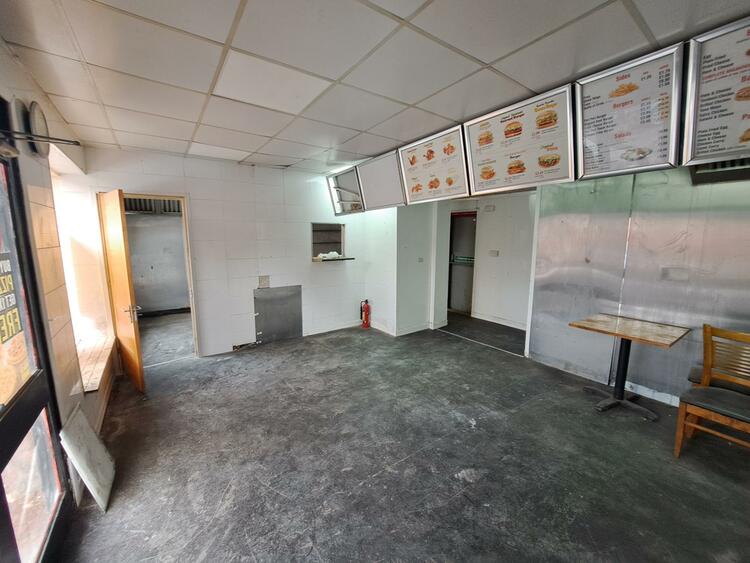 The property was last used as a café where the kitchen area is separated from the seating area by a partition wall.