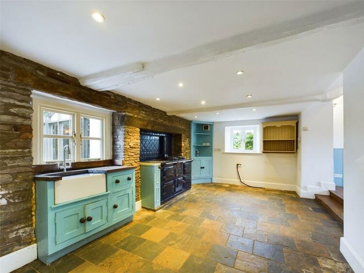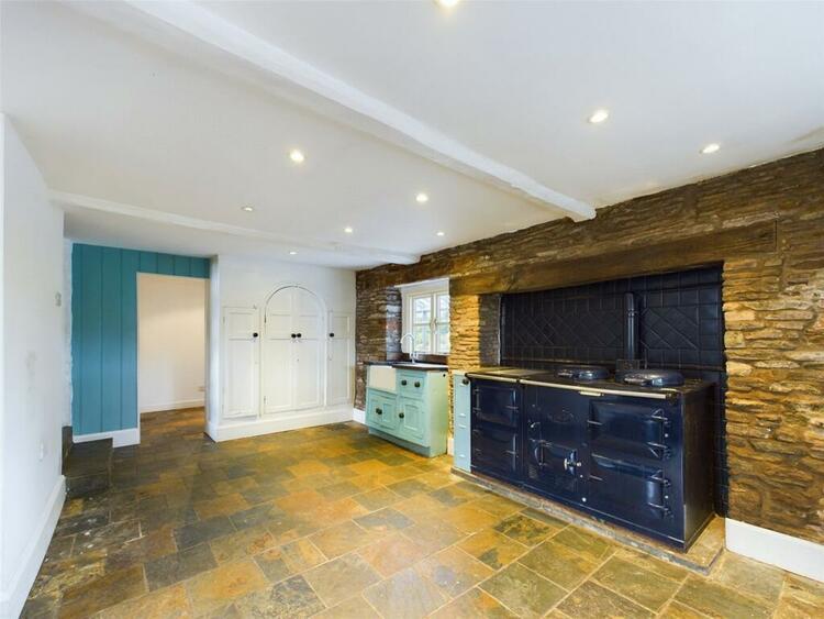 Continuation of the slate flooring. A selection of farmhouse style cupboards, central oil fired AGA with rear feature tiled wall. Belfast sink with mixer tap and base cupboard. Original feature store cupboards to one wall. Side facing uPVC double glazed window, rear single glazed window to the garden room. There is also access to the kitchen from the entrance hall.