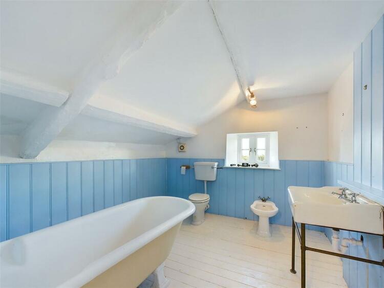 Original claw foot cast iron bath. Wood panelled feature walls. Wash hand basin. Bidet. Period sink with copper stand. Ladder towel rail. Double glazed window to side aspect. Painted ceiling beams and pine flooring.