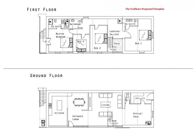 The Fruit Barn proposed accommodation extends to 2,841 square feet (external measurements) arranged over two floors and briefly comprising large open plan kitchen/dining room, living room, snug, utility/WC and to the first floor 4 double bedrooms, 2 en-suites and family bathroom.