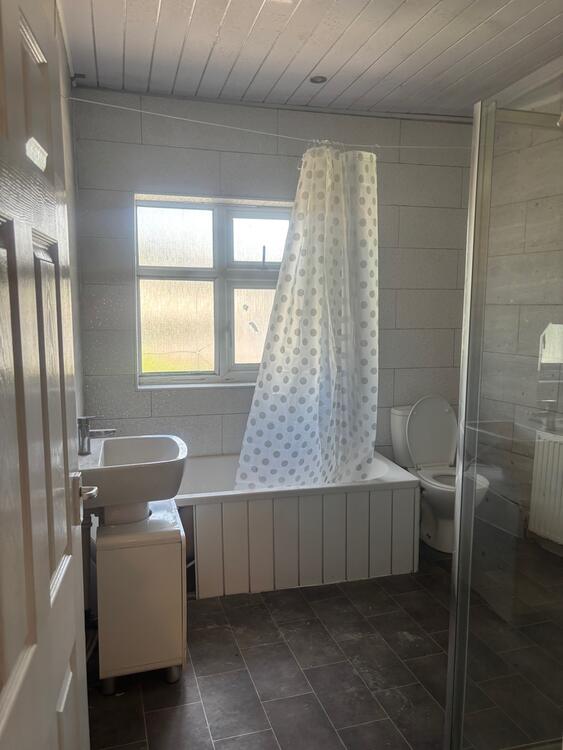 Bath with mixer tap and shower attachment, wash hand basin, low level w.c., partially tiled walls, radiator and double glazed window to rear.