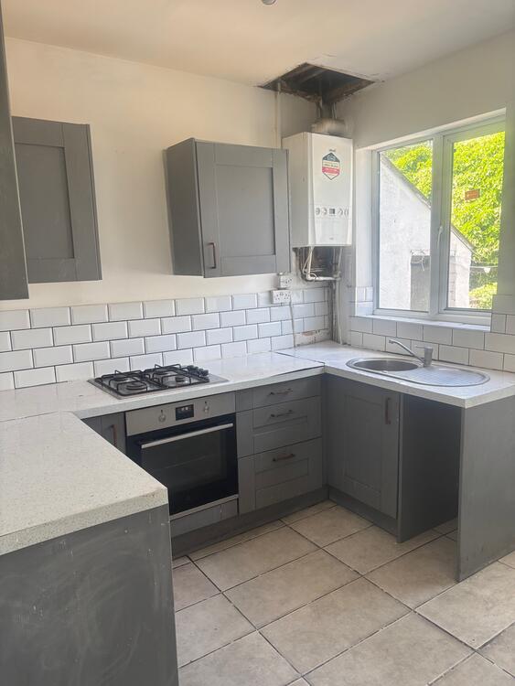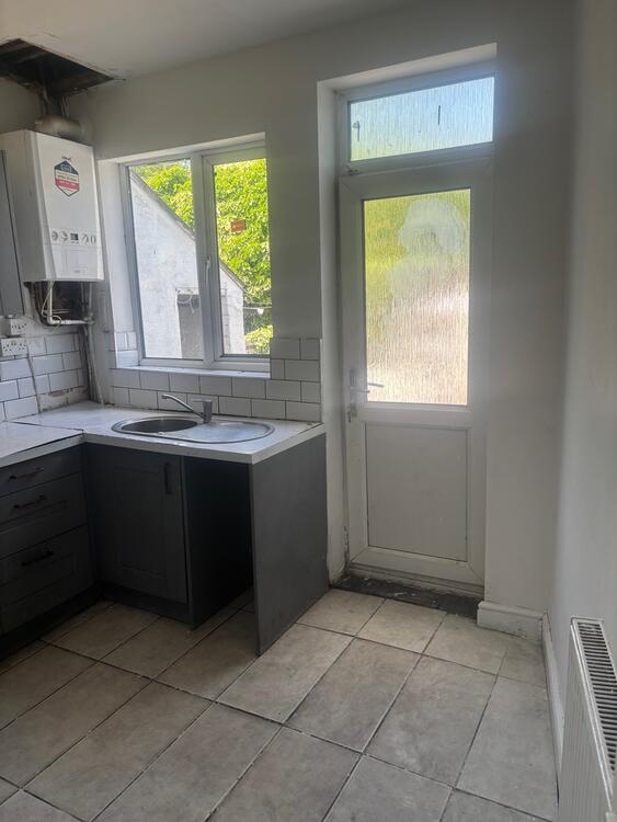 Fitted with wall and base units, stainless steel sink and drainer, work surfaces with tiling to splashbacks, built-in electric oven, gas hob, cooker hood, radiator and double glazed door leading out to rear courtyard.
