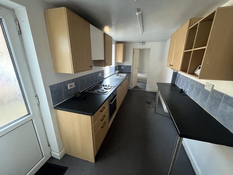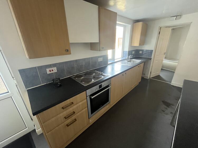 A good size kitchen with modern base and wall units, sink, work surfaces, built in oven, hob and extractor, breakfast bar, window to side and door to garden.