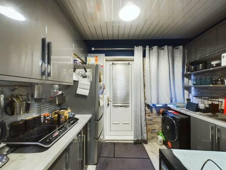 Modern kitchen with base and wall units, work surfaces, sink, plumbing for washing machine, upvc framed double glazed window and door accessing the front garden.