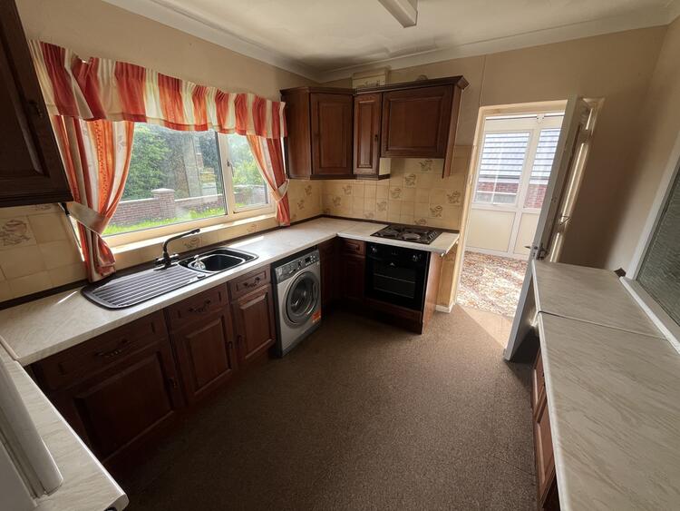 With base and wall units, oven, hob and extractor, work surfaces with inset sink, space for appliances, window to front.