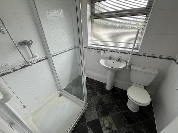 With white suite comprising low flush w.c. wash hand basin and shower cubicle. Part tiled walls, radiator and window to front.