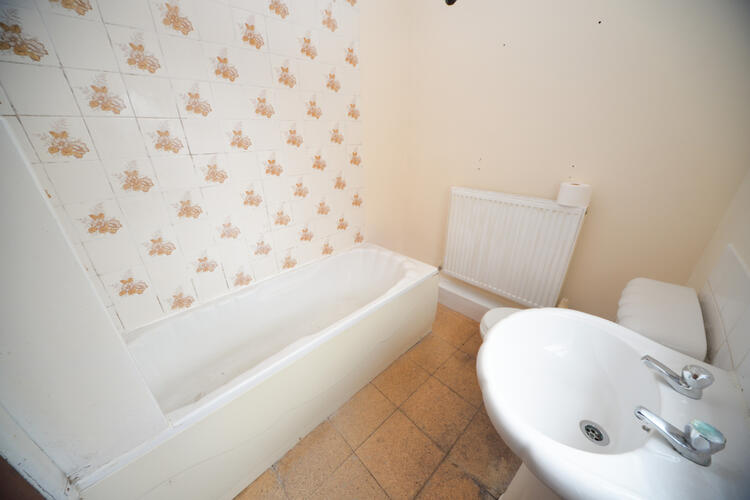 Fitted with a panelled bath with separate Triton electric shower over, pedestal hand wash basin and wc. There is an obscure window to the side aspect, tiled surrounds, ceiling light point and radiator.