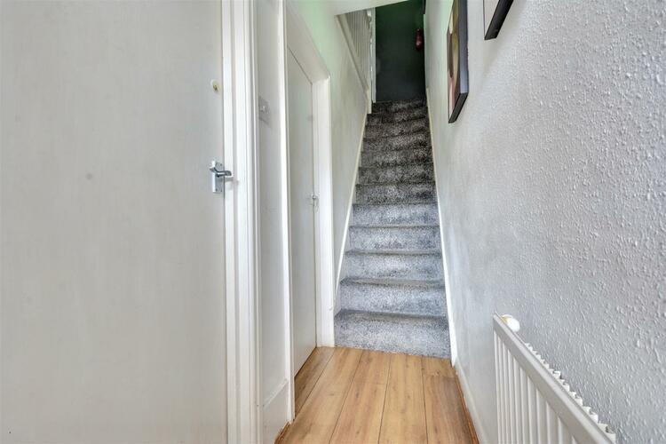 Wooden entrance door to the front elevation, laminate floor covering, wall mounted radiator, emergency lighting, carpeted staircase leading to the first floor landing, doors leading off to: