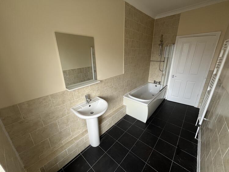 Having low flush w.c. wash hand basin and panel bath with shower over. Heated towel rail, part tiled walls and window to side.