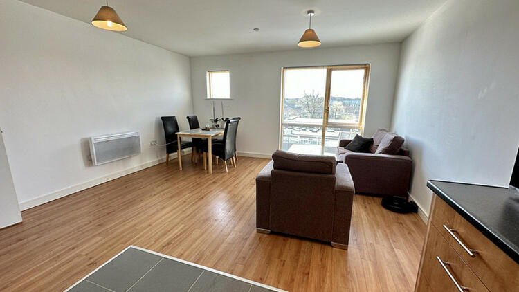 The apartment is located on the first floor, and has an open plan living space with kitchen, dining and lounge areas. There is one bedroom and a shower room.
