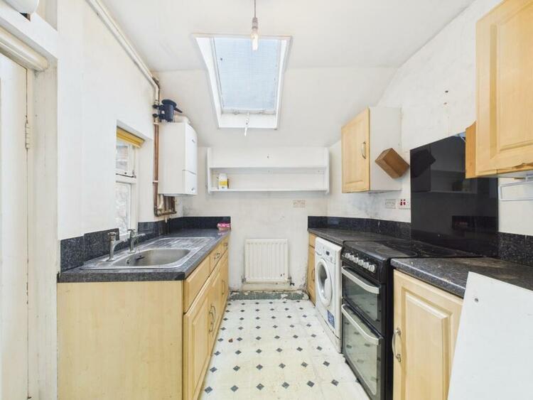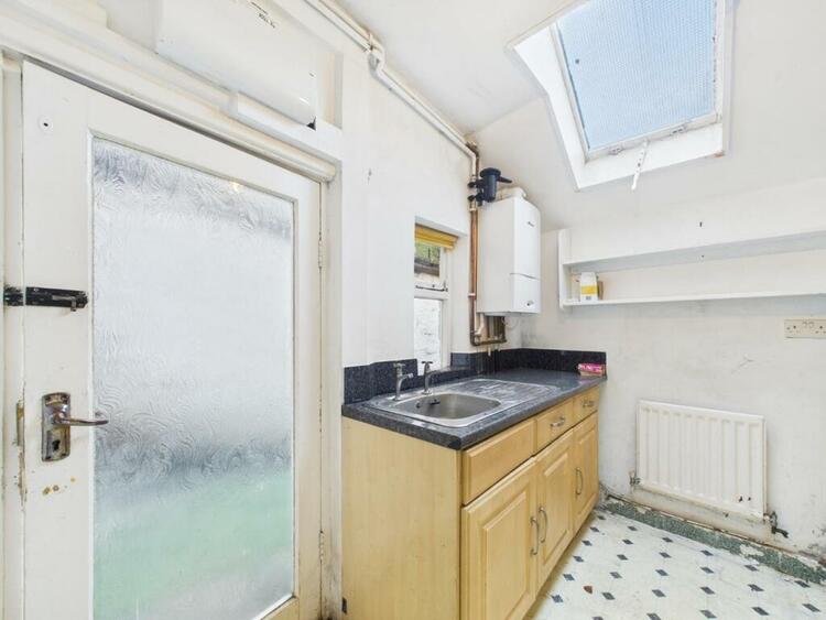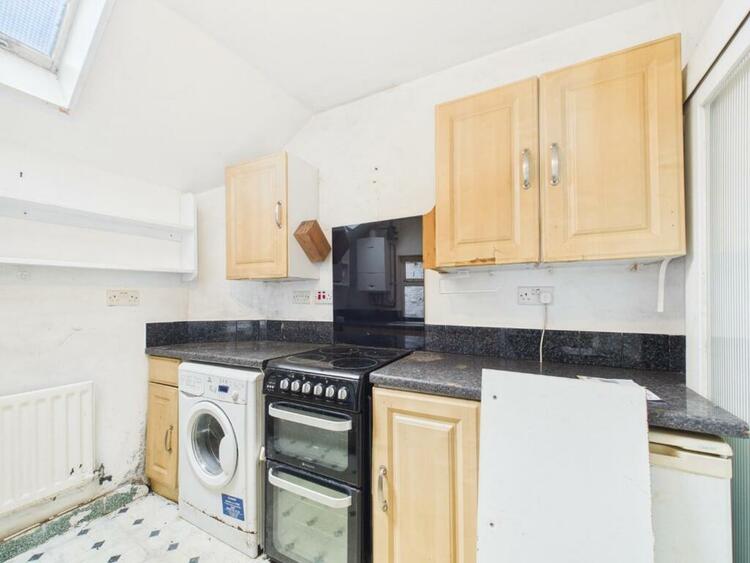 With a side aspect window and Velux roof light, this room has vinyl flooring and is fitted with wood effect wall, base and drawer units with a granite effect work top over. There is a stainless steel sink and a free-standing electric oven with glass splashback behind, under-counter space for a free-standing automatic washing machine and fridge freezer, both of which are currently in situ. The Worcester combi boiler is also located here. A sliding door opens into the hallway, where stairs rise to the: