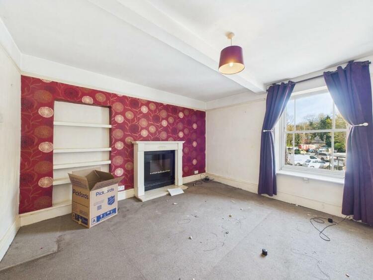 A spacious room with a front aspect sash window, inset shelving and a feature fireplace with electric fire and marble hearth.