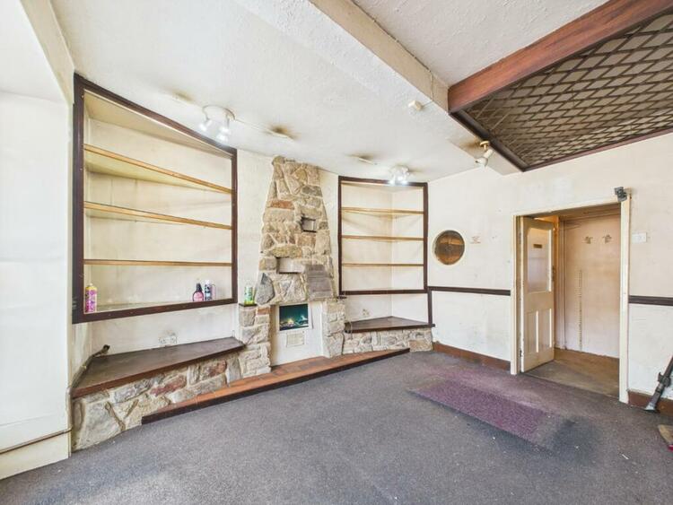 With a sizeable front aspect bay window, which supplies this room with lots of natural light and a stone feature fireplace with inset shelving. A rear aspect wooden door opens into the:
