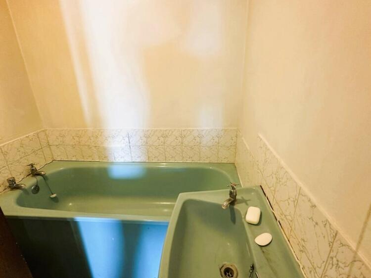 Containing a blue coloured suite comprising panelled bath, pedestal wash hand basin with splash back tiling and low flush wc.
