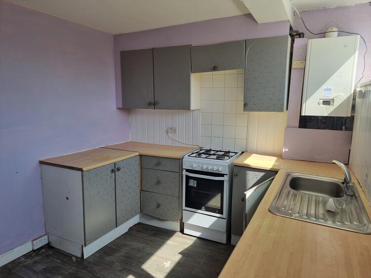 Laminate wall and base units, single bowl single drainer stainless steel sink unit with mixer tap over, gas cooker point, plumbing for washing machine, combi boiler, UPVC double glazed window and door.