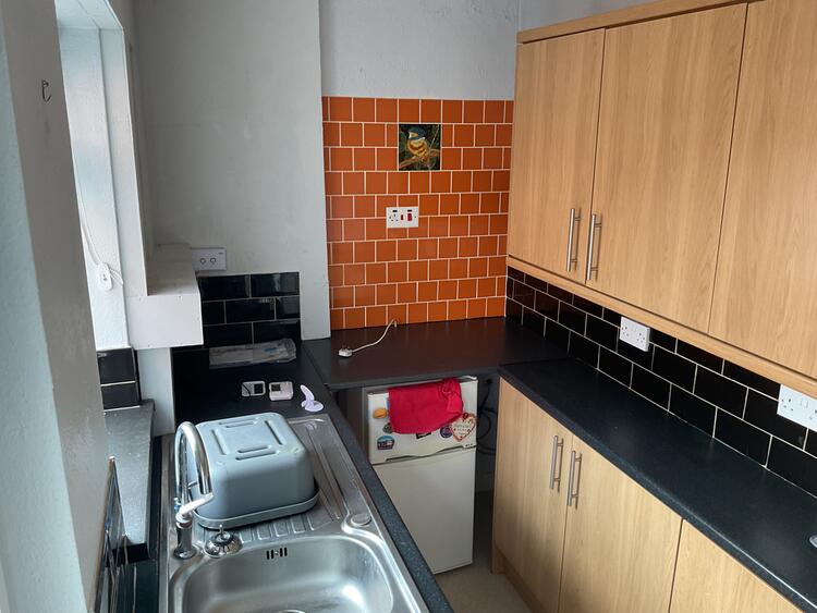 Having grey fitments comprising one double base unit, two single base units and two single wall units, together with integrated electric oven, stainless steel sink unit with single drainer, uPVC double glazed door and uPVC double glazed window.