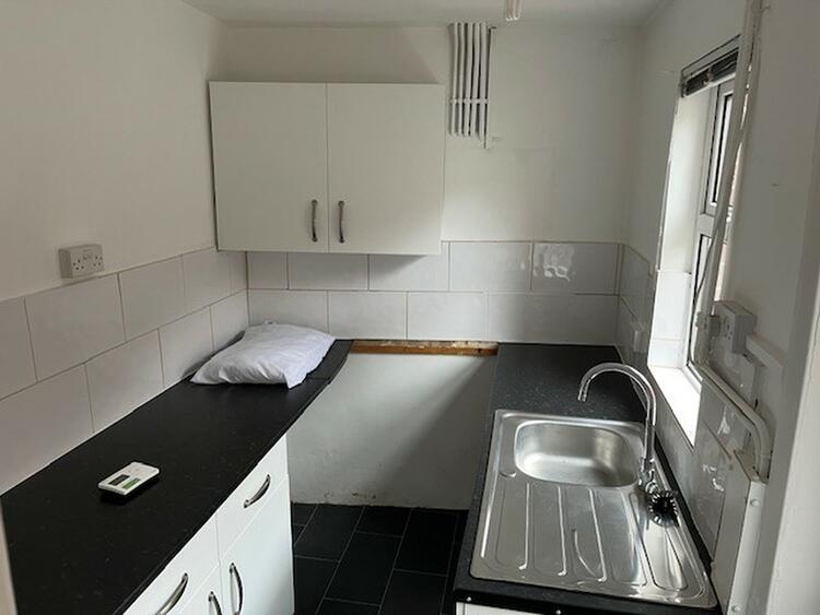 Having white fitments comprising two double base units and one double wall unit, together with stainless steel sink unit with single drainer and uPVC double glazed window and side door.