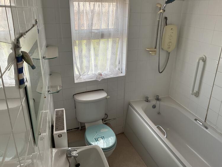 Having white suite comprising of low-level WC, pedestal wash hand basin and panelled bath with electric shower unit over, together with central heating radiator and uPVC double glazed window.