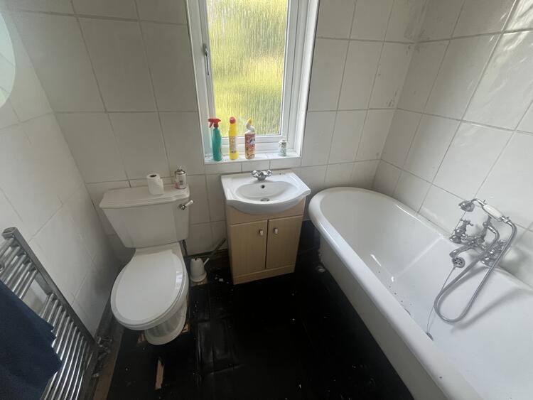 Comprising low flush w.c. wash hand basin and roll top bath. Heated towel rail and window to rear.