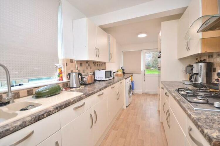 A range of wall and base level units with work surfaces over, sink and drainer units with mixer tap over, hob with extractor. Space for appliances, dual aspect windows to side and rear.