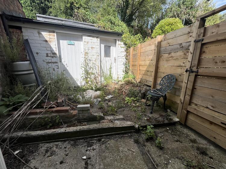 Courtyard garden to rear with two brick outbuildings. Shared gated path to front.