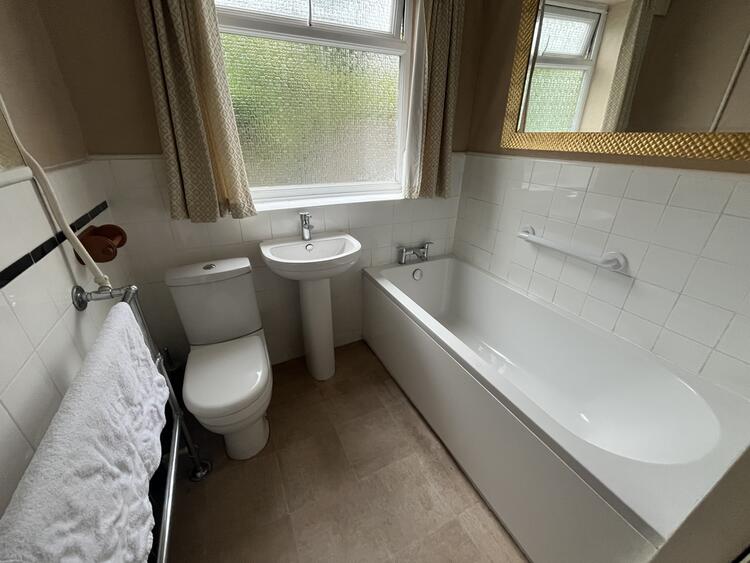 White suite comprising, low flush w.c. wash hand basin and panel bath. Heated towel rail, airing cupboard and window to side.