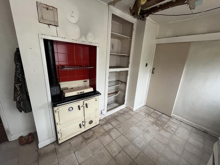 With basic units, sink, Aga, large pantry, window to rear and door to garden.