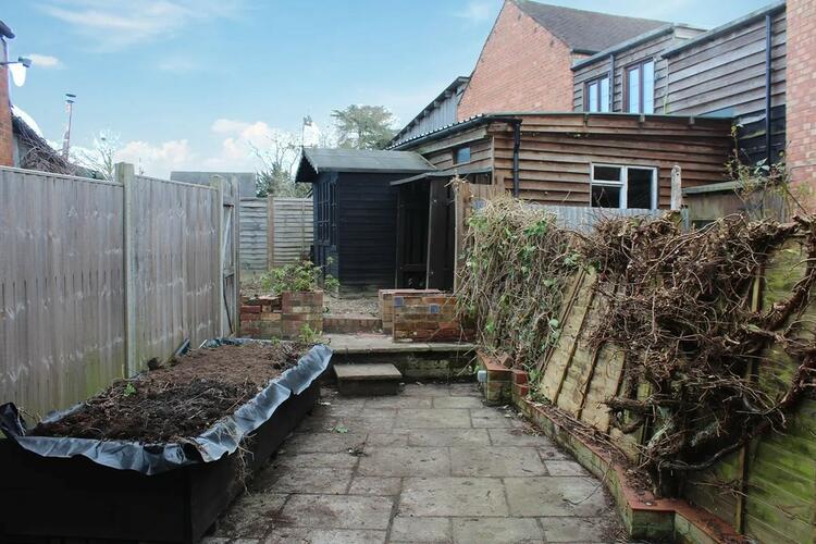Garden: With a paved terrace garden with climbing shrubs and raised bed leading to a secluded rear garden area with