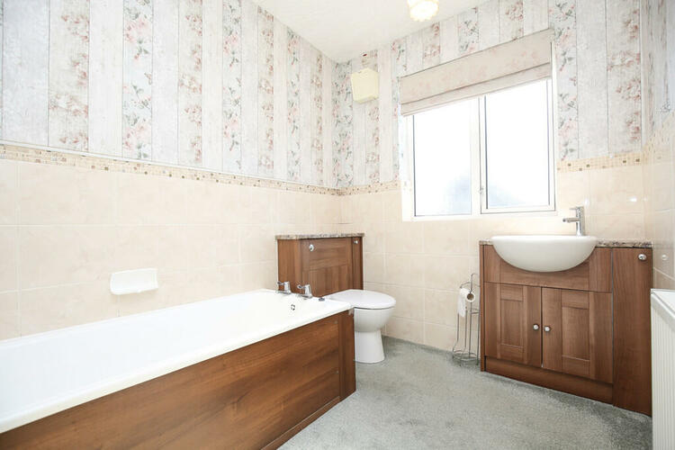 Opaque double glazed window to rear aspect, double panelled radiator, tiling to half height, wash basin with useful vanity storage below, low level WC and a panelled bath.