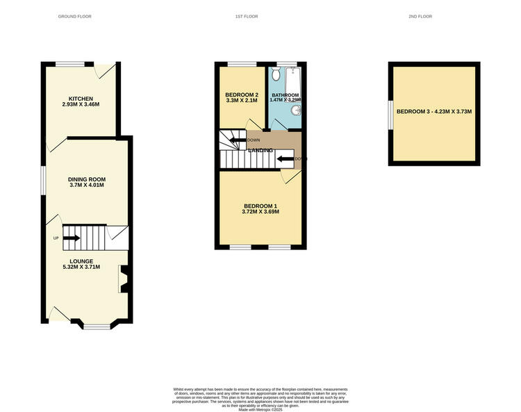 In summary, the property features an entrance leading into the lounge, a separate dining area, and a kitchen at the rear. On the first floor, there is one double bedroom and one single bedroom along with a family bathroom, while the second floor hosts another double bedroom.