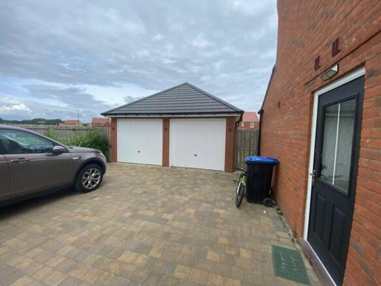 Garden to front. Large driveway with ample parking. Detached double garage. Enclosed rear garden.