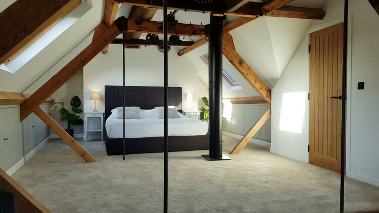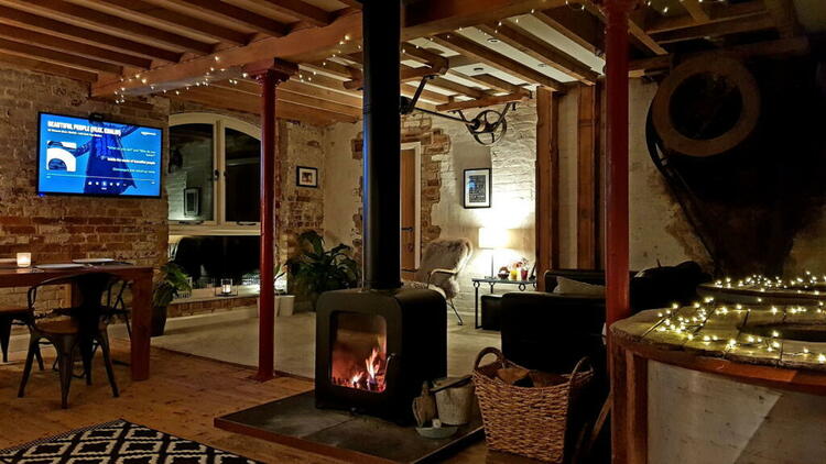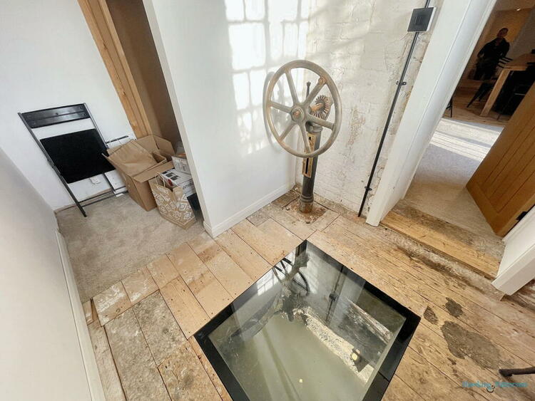 Carpeted floor, amazing views along the river through the arched original window, Mill wheel and original belt, Mill stone drums and door to;