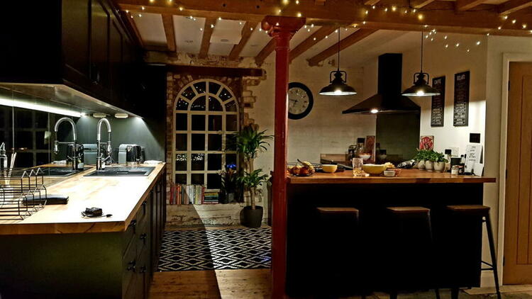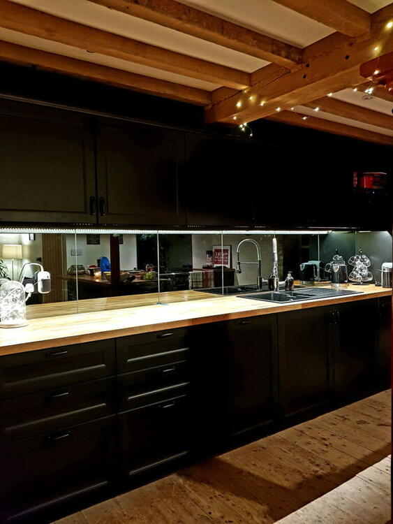 Fitted worktop, window overlooking the river and fields, walk-on glass window over the river, recessed storage, original water mill cog wheel.