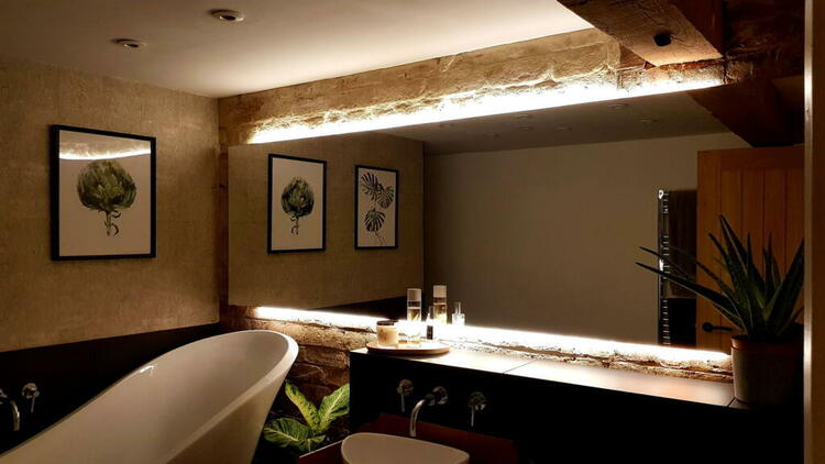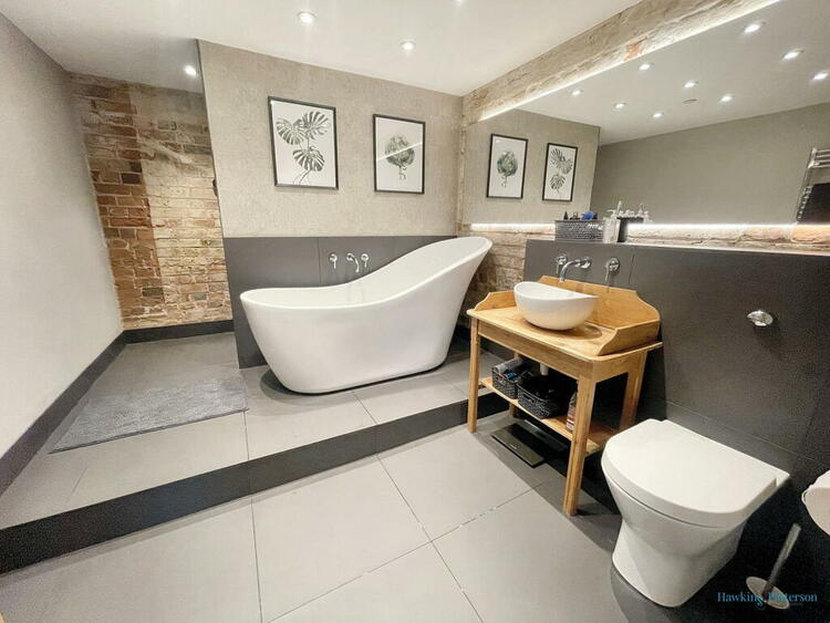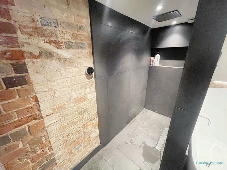 LED downlights, chromed heated towel rail, tiled floor, tiled splashbacks and exposed brickwork, feature free standing slipper bath and mixer tap, WC, pine vanity unit and bowl basin with mixer tap. Large walk-in shower area with full tiling, Mira wireless digital shower, large rain head shower and extractor fan.