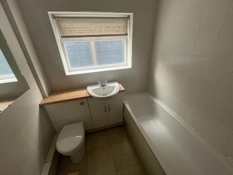 With low flush wc, wash hand basin in vanity and panelled bath with shower over. Built in storage, radiator and window to side.