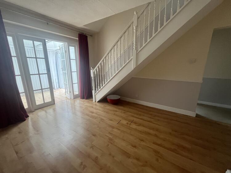 With radiator, stairs off and French doors to conservatory. Note that there is some damage to the ceiling caused by a leak from the upstairs shower.
