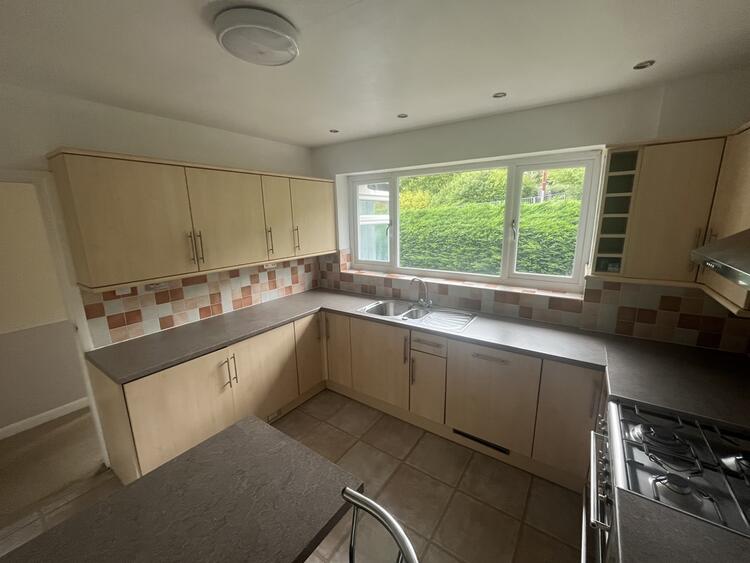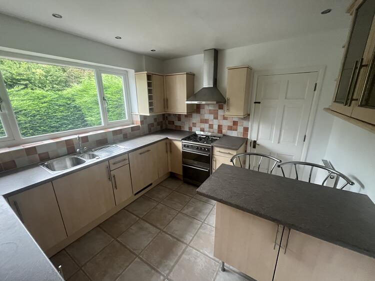 Having base and wall units, sink, built in fridge, freezer and dishwasher. Cooker with hood over, breakfast bar, window to front and door to side.