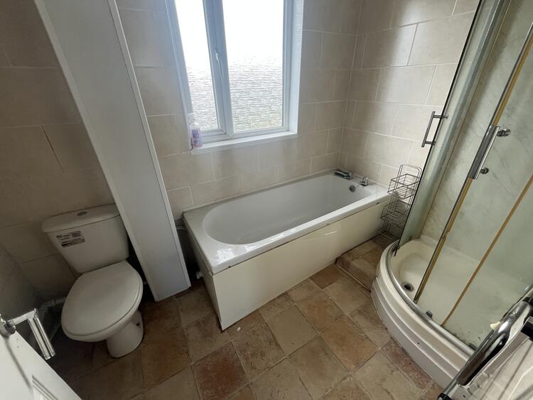 Comprising low flush w.c. wash hand basin, panel bath and separate shower cubicle. Heated towel rail and window to rear.
