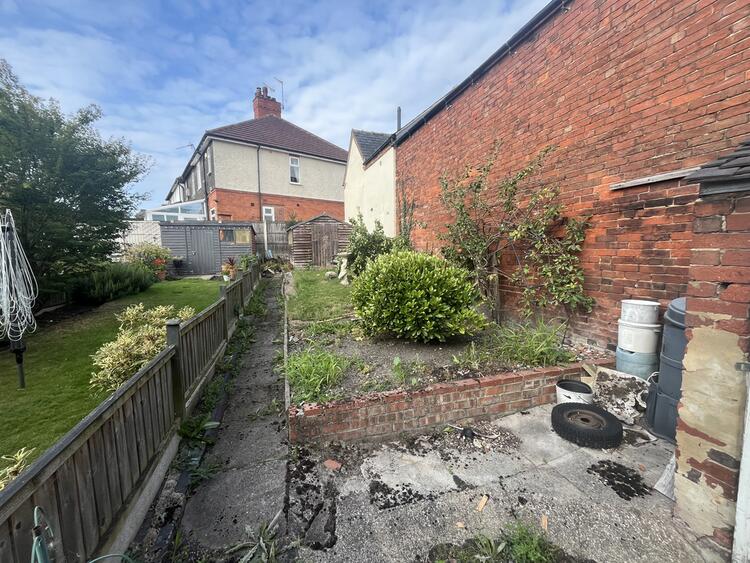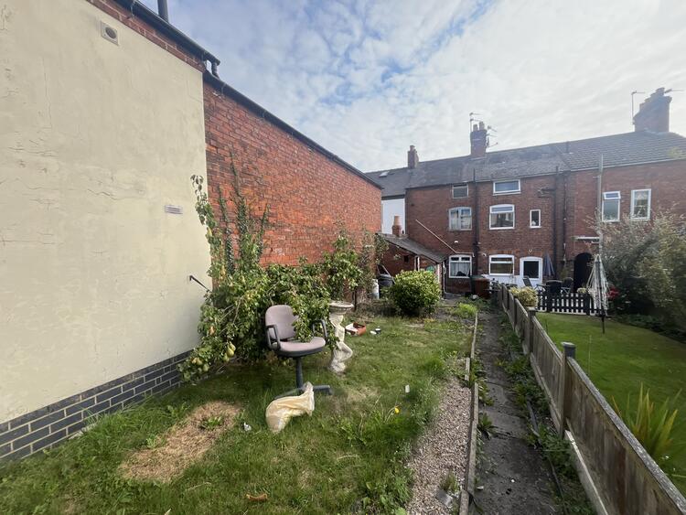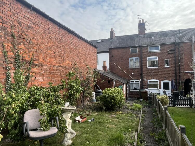 Small garden to front. Good size rear garden with seating area, lawn, flower beds, timber store and attached brick store.